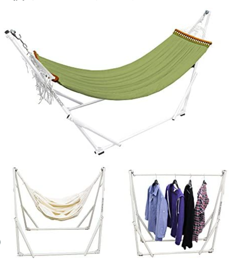 下のハンモックはチェアーとハンガーラックと三通りの使い方が出来る優れものです。