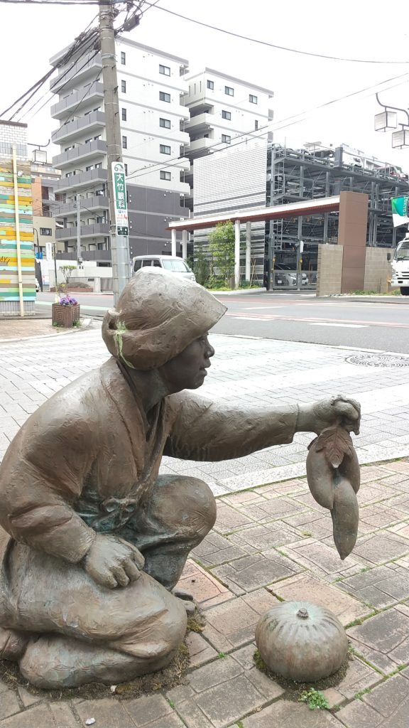 その頃の行商の女性の銅像が車が走り抜ける道沿いに、「芋はいらんかね?」と語りかけるようにたたずんでます。