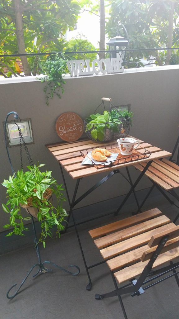 ベランダに作ったベランダカフェ風で、ボーっと緑を眺めながら珈琲をいただきます。
